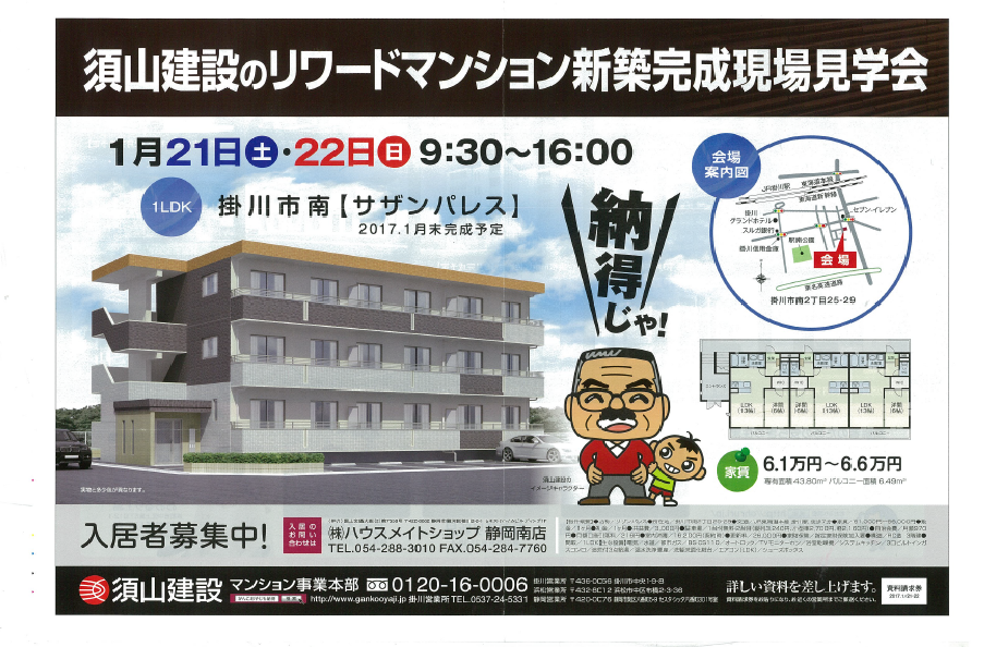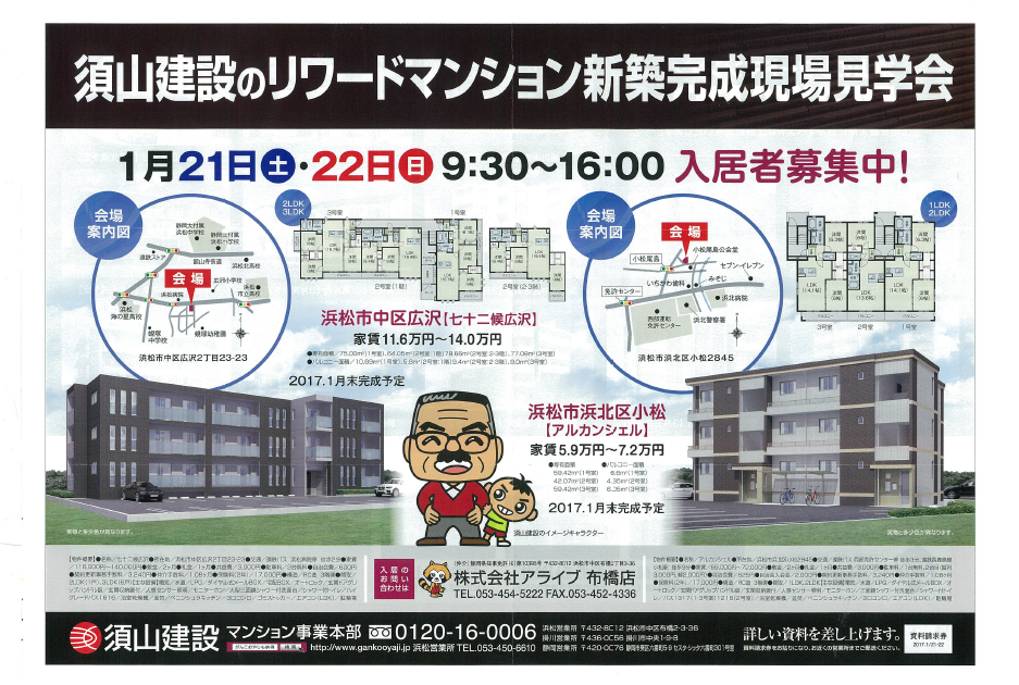 須山建設のリワードマンション新築完成見学会を三箇所で行います。