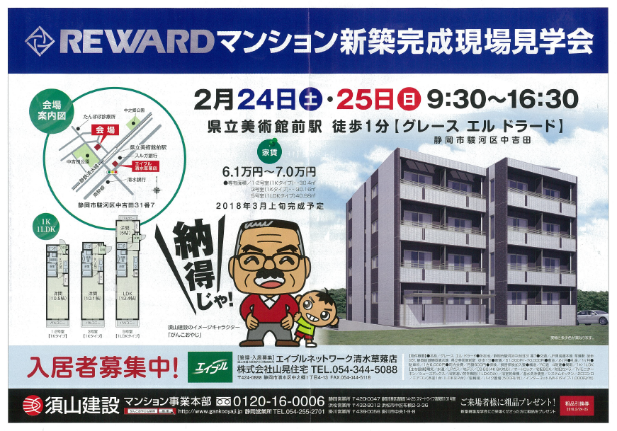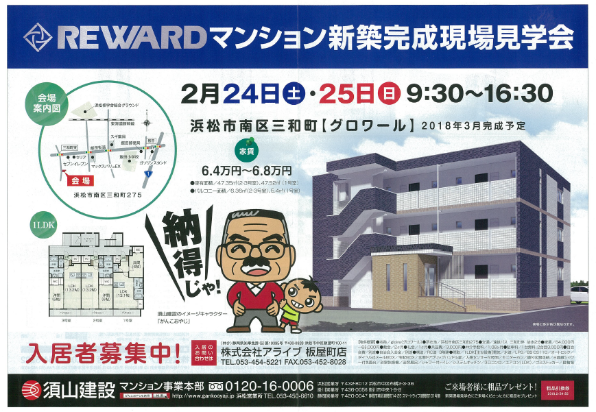 浜松市南区三和町と静岡市駿河区中吉田に完成した賃貸マンション見学会を行います。